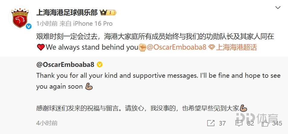 今天,奧斯卡在個人微博報平安,他寫道:感謝球迷們發(fā)來的祝福與留言。請放心,我沒事的,也希望早些見到大家。海港官方轉(zhuǎn)發(fā),并配文:艱難時刻一定會過去,海港大家庭所有成員始終與我們的功勛隊長及其家人同在。